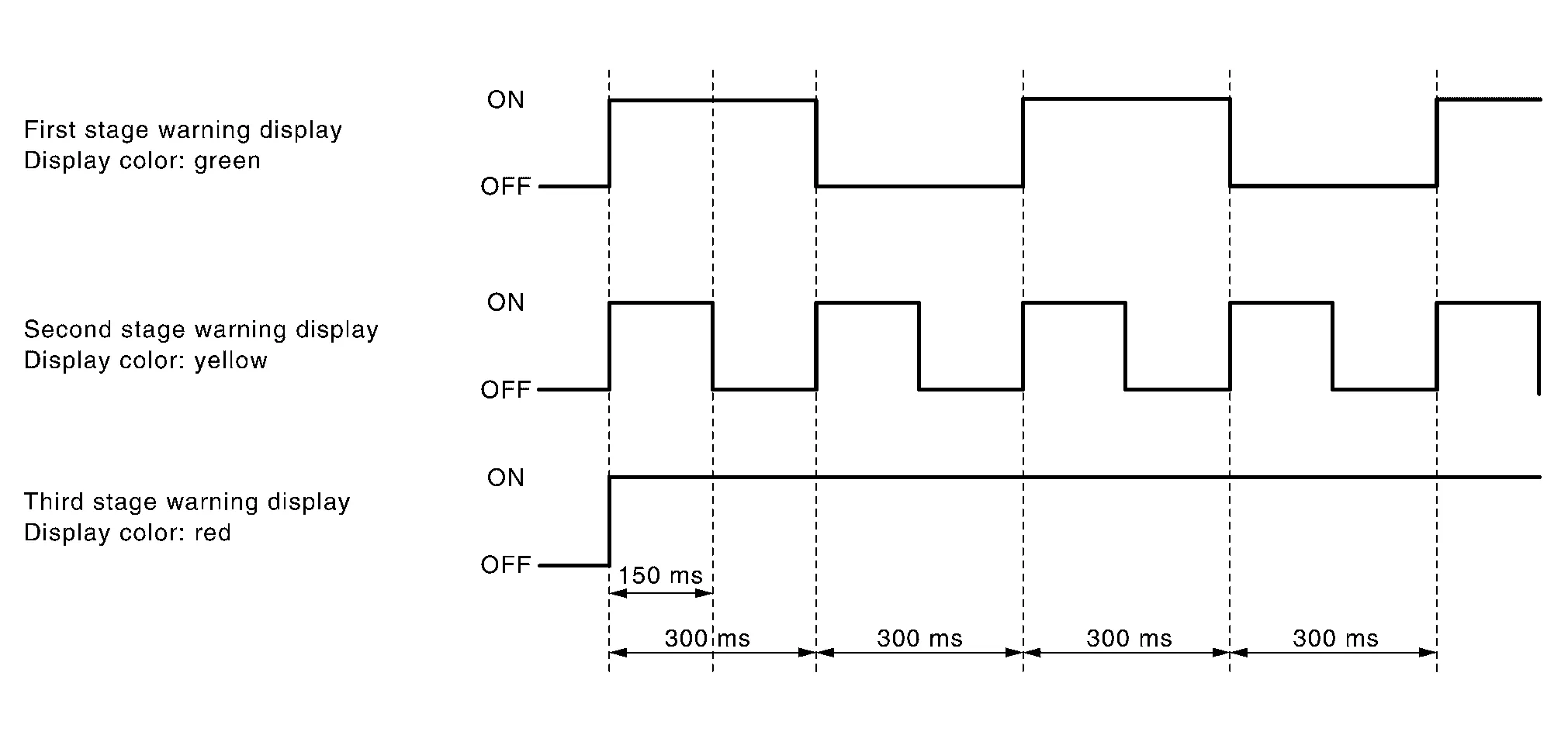 Audio unit (without Navigation system) or AV control unit (with Navigation system) changes display color and indicator blinking cycle according to detection distance.