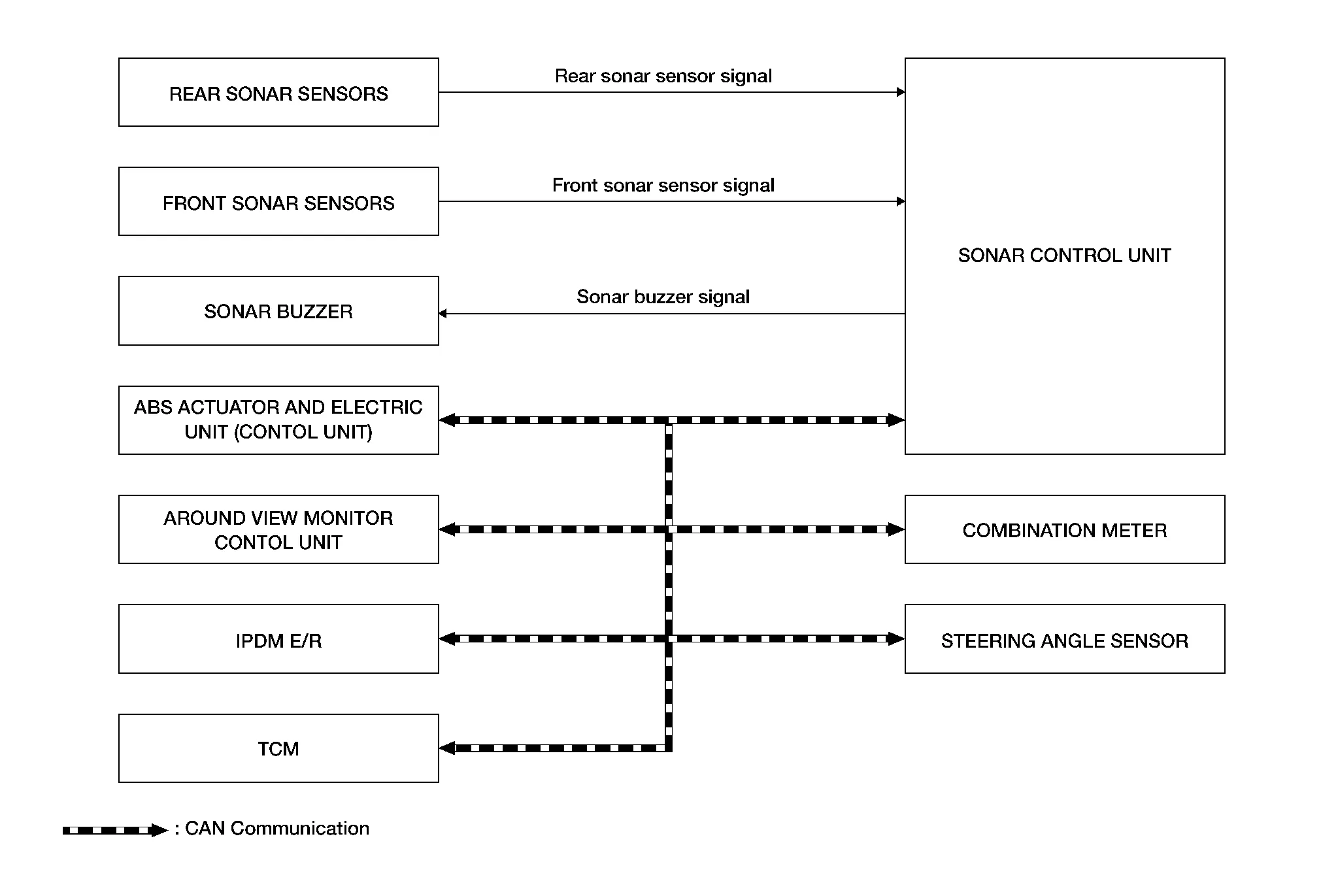 | IPDM E/R | Transmits the battery voltage signal to sonar control unit via CAN communication. |
