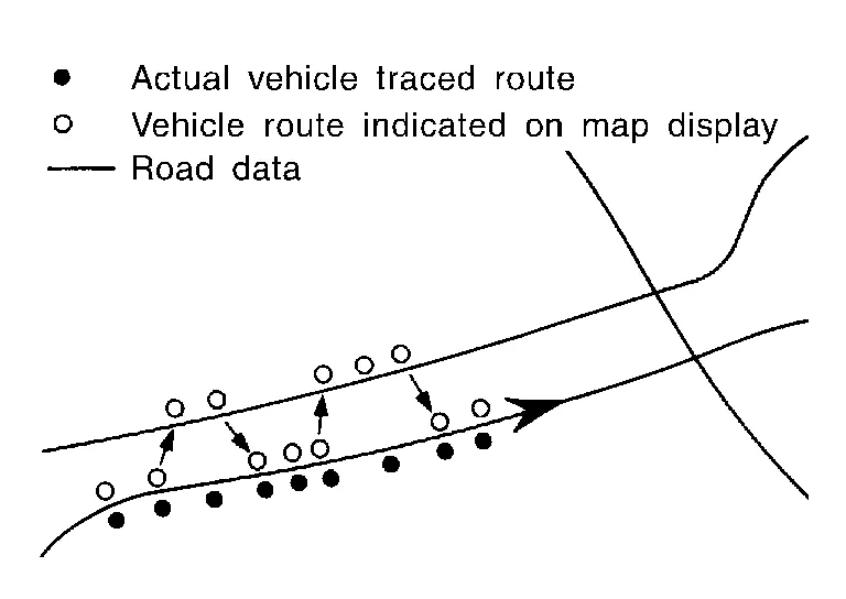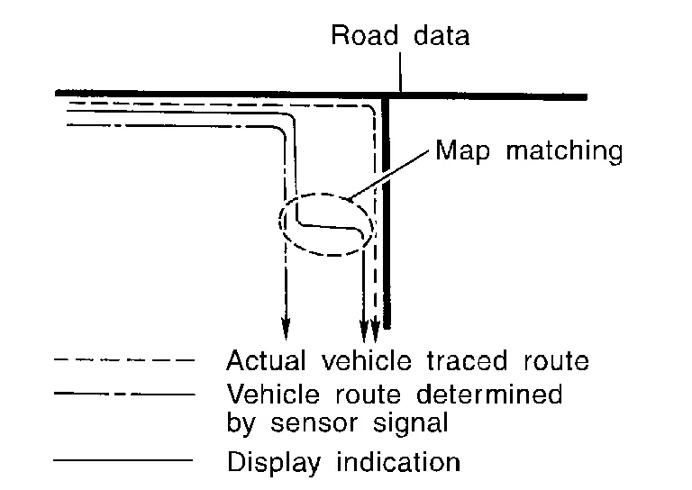 Effective range for comparing the Nissan Murano vehicle position and travel direction calculated by the distance and direction with the road data read from the map SD-card is limited. Therefore, correction by map-matching is not possible when there is an excessive gap between current Nissan Murano vehicle position and the position on the map.