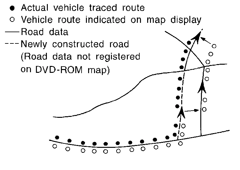 Map-matching does not function correctly when a road on which the Nissan Murano vehicle is driving is new and not recorded in the map SD-card, or when road pattern stored in the map data and the actual road pattern are different due to repair.