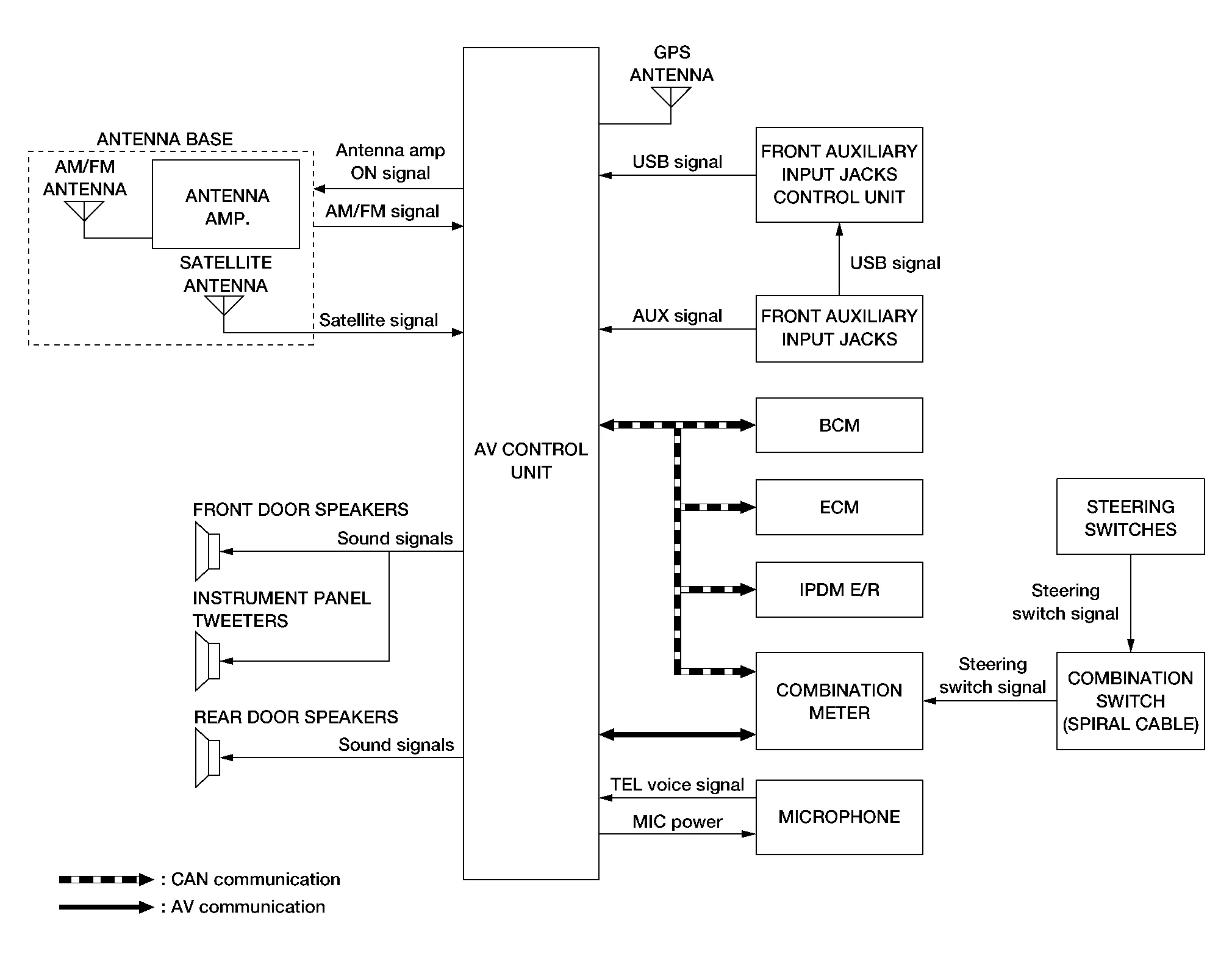 AM/FM signals received by the AM/FM antenna are amplified by the antenna amp. and sent to the AV control unit. The AV control unit then sends audio signals to the speakers.