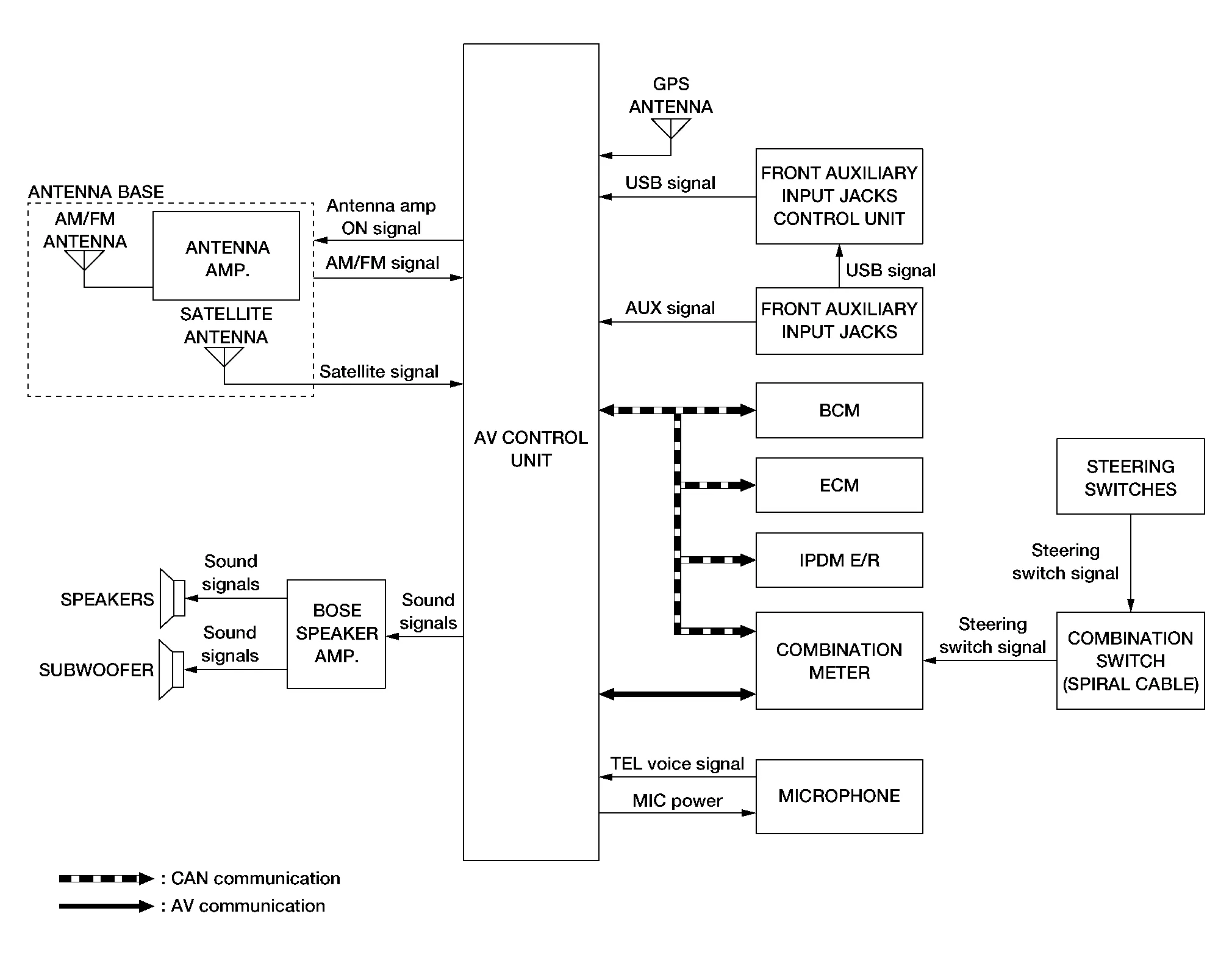 Sound signals are transmitted from AUX jack to the AV control unit. The AV control unit then sends audio signals to the Bose speaker amp. The Bose speaker amp. then sends the audio signals to the tweeters, speakers and subwoofer.