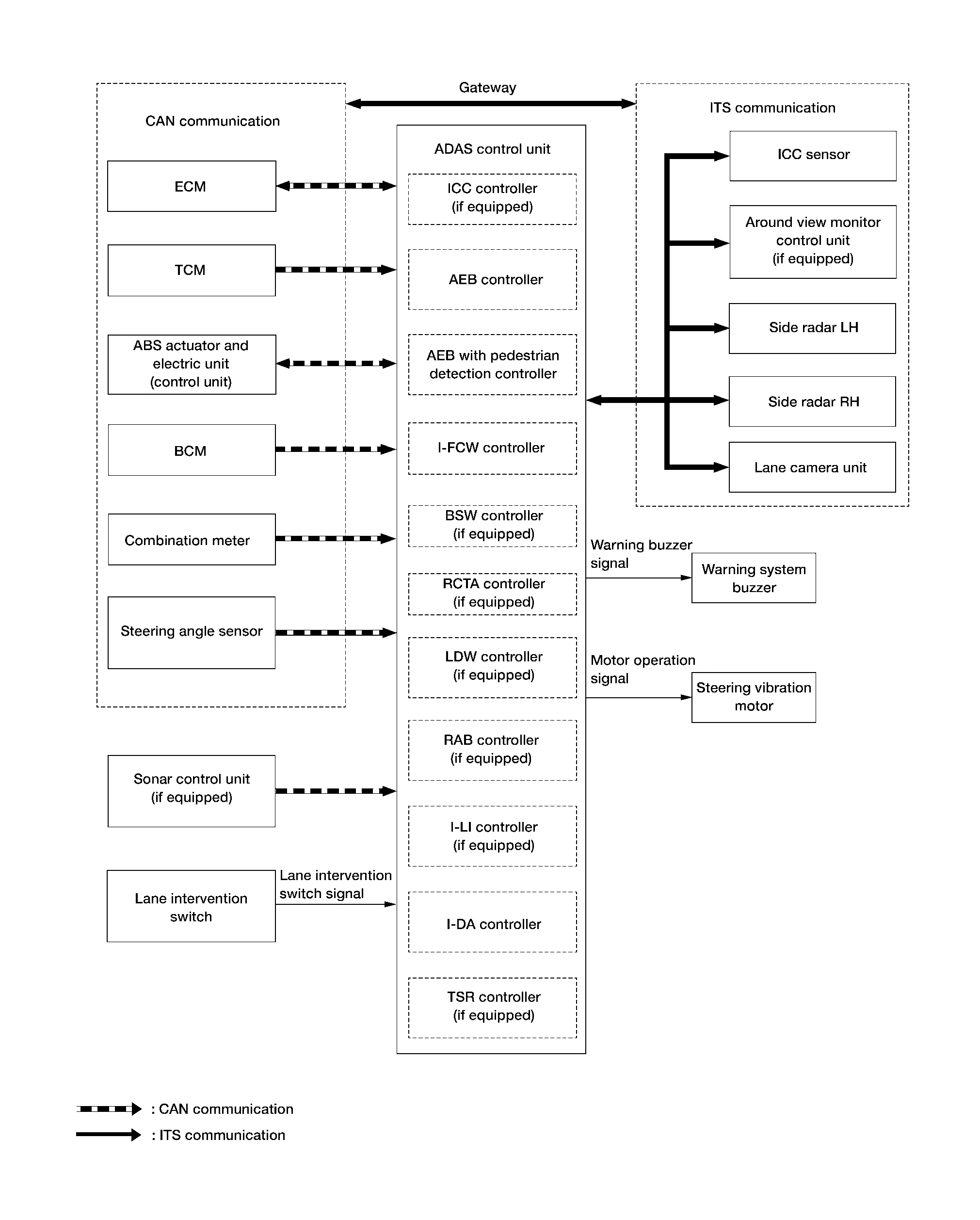 ADAS* control unit controls the following systems based on ITS communication signal and CAN communication signal from each control unit.