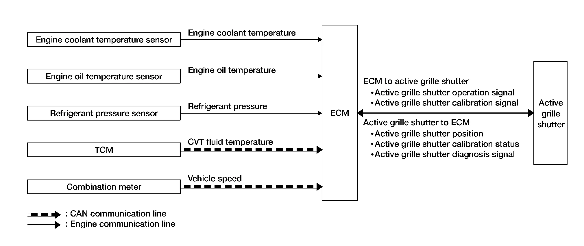 ECM controls active grille shutter system by detecting vehicle status through respective modules and sensors.