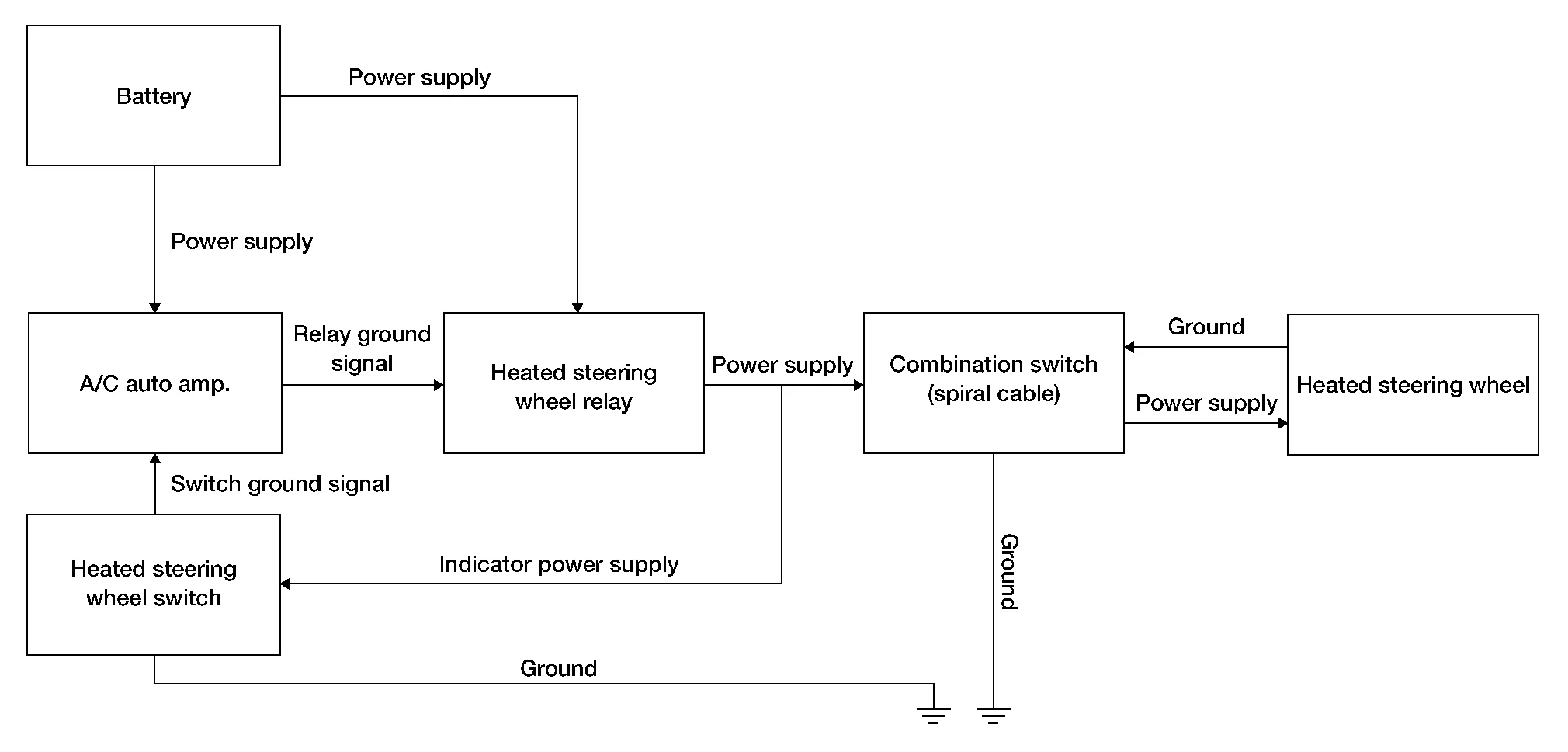 | Heated steering wheel switch | Switch ground signal | Heated steering wheel control | Heated steering wheel |