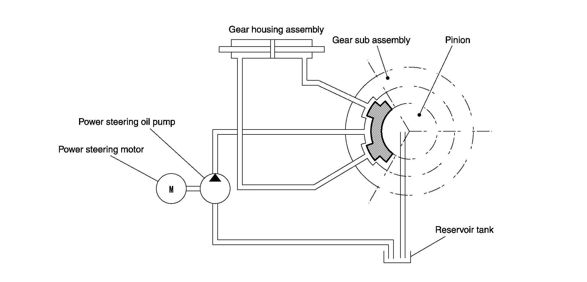 The system is composed primarily of the power steering oil pump assembly (power steering control module, power steering motor, power steering oil pump, and reservoir tank), hydraulic pipes, and steering gear assembly.