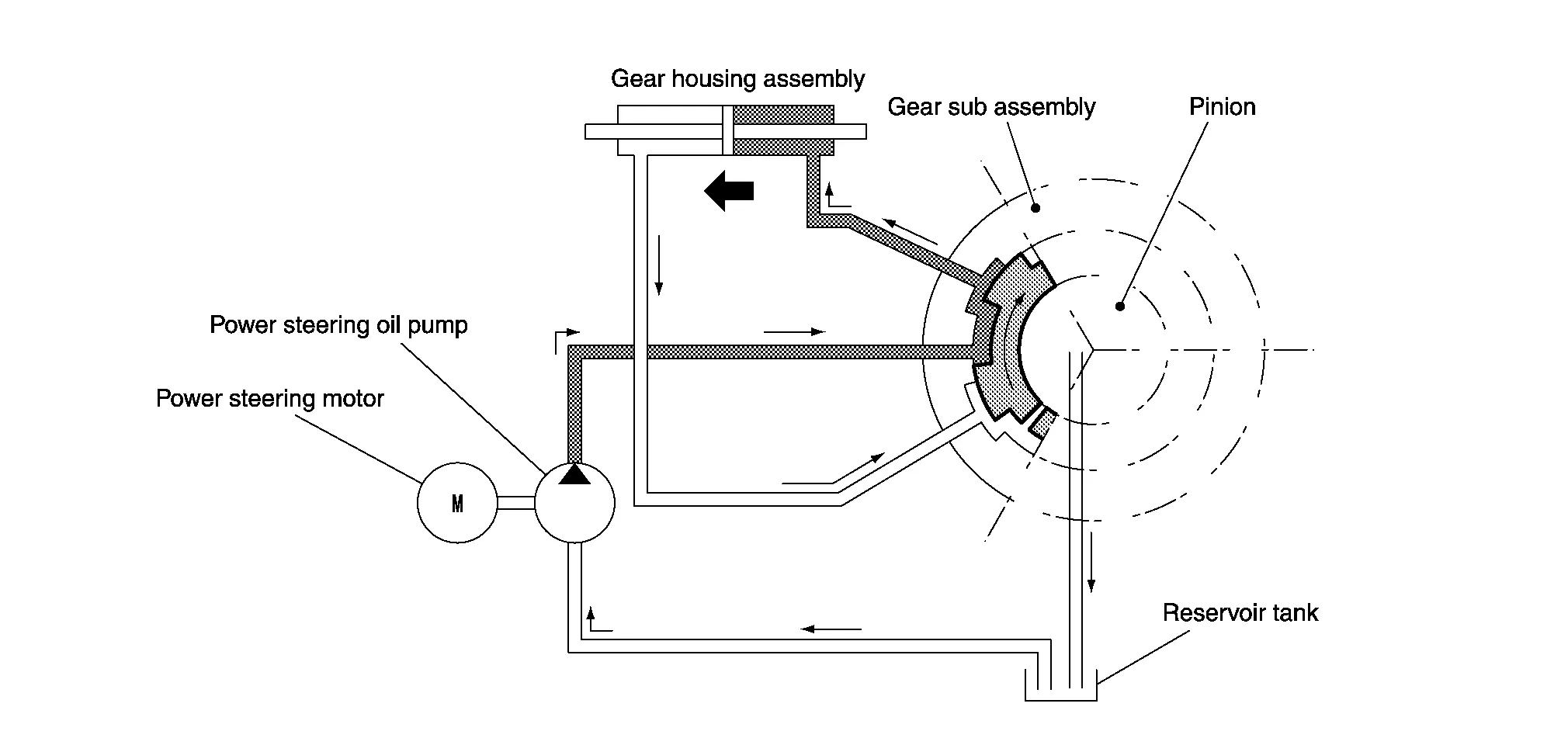 The hydraulic routes open from power steering pump to gear housing right side and from gear housing left side to reservoir tank, providing left directional assist force to the rack.