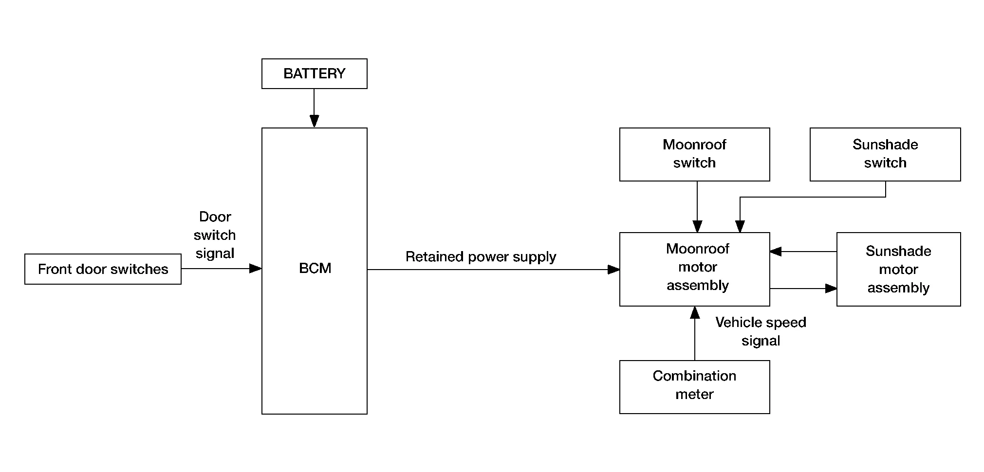 | Moonroof switch | Moonroof signal (tilt up/ down or slide open/close) | Receives signal and moves the moonroof and sunshade assembly to the correct position. | Moonroof motor and/or Sunshade motor |