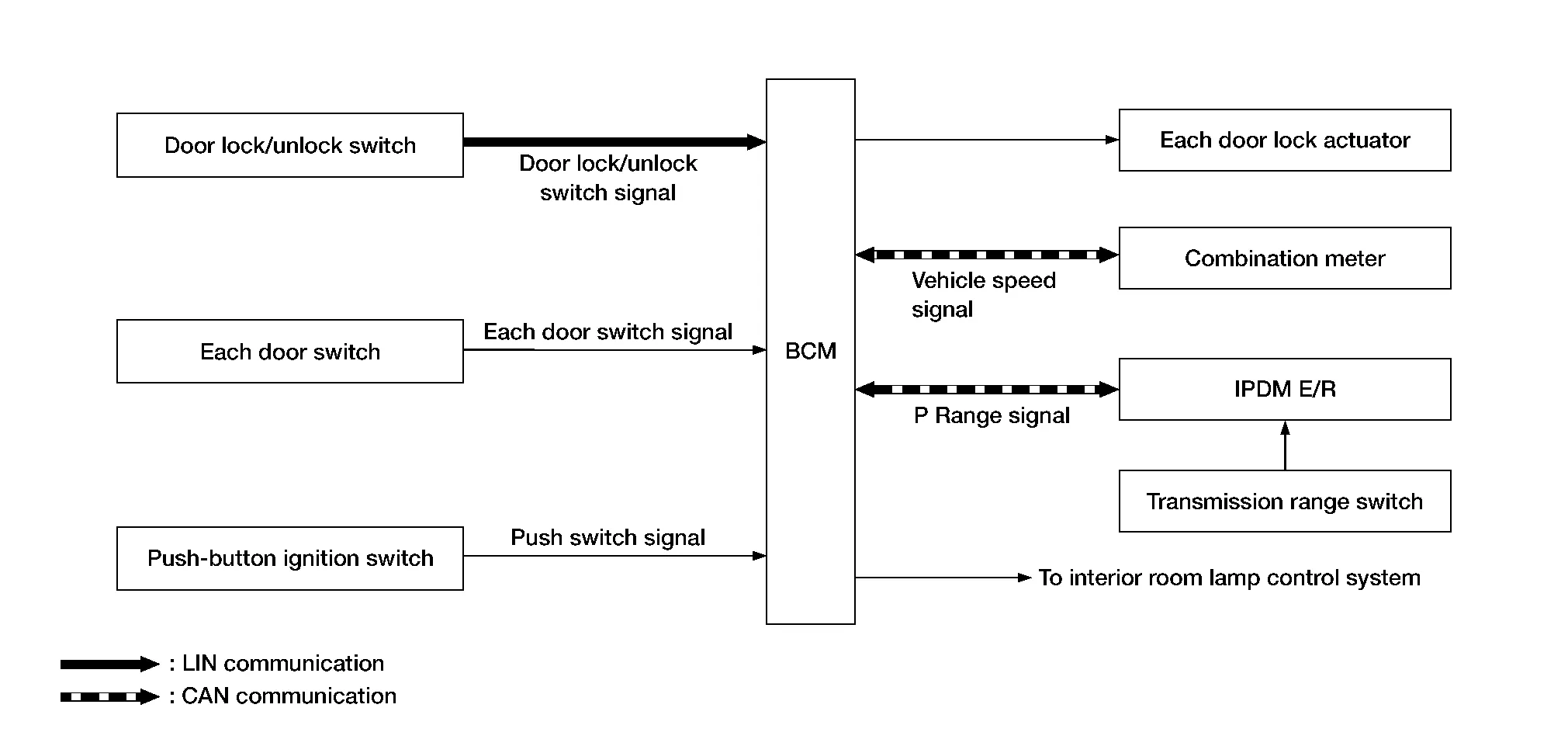 | Door lock/unlock switch signal | Door lock/unlock switch | BCM | The BCM receives door lock/unlock switch signals inputs and activates the actuators accordingly. |
