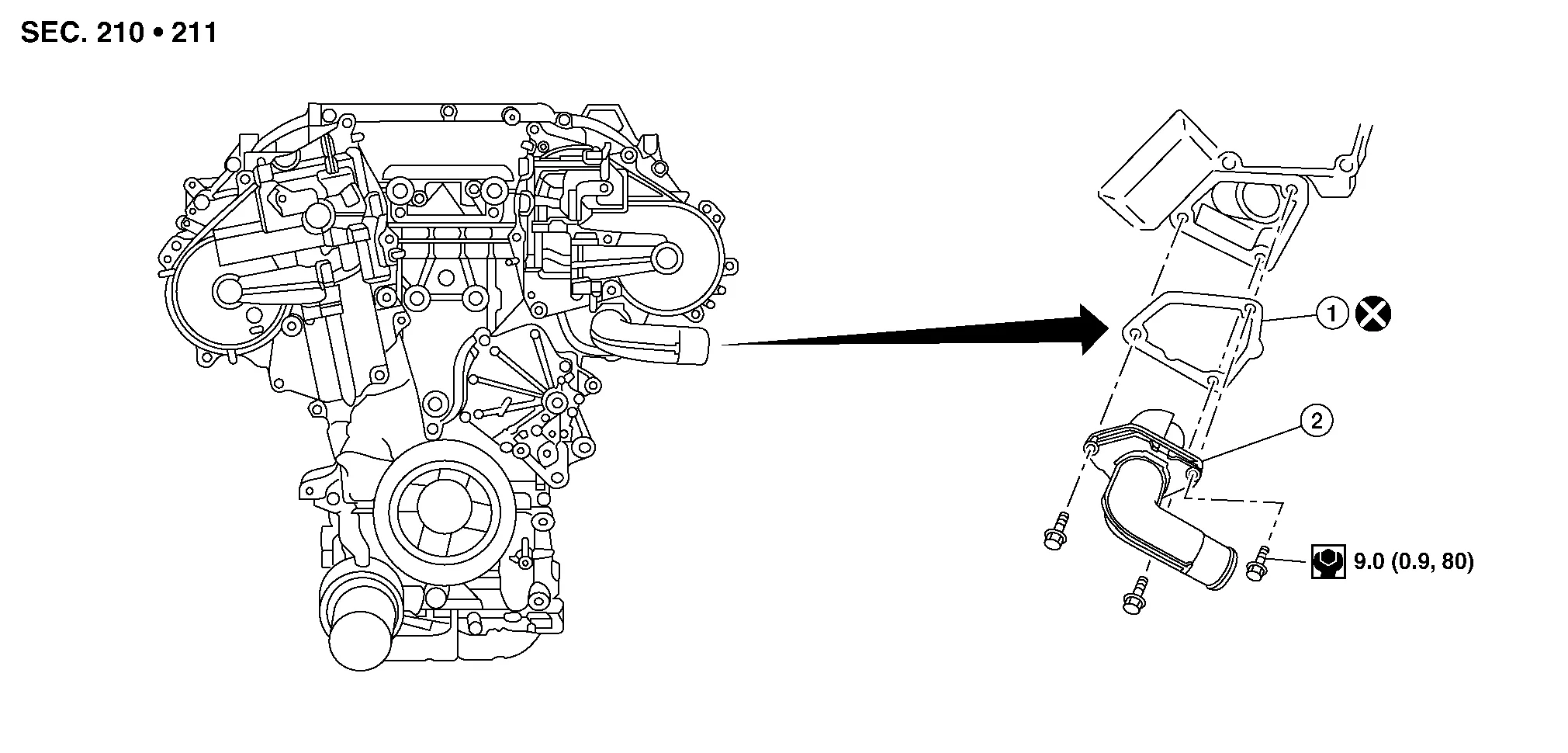 | 1. | Gasket | 2. | Thermostat assembly (water inlet) |