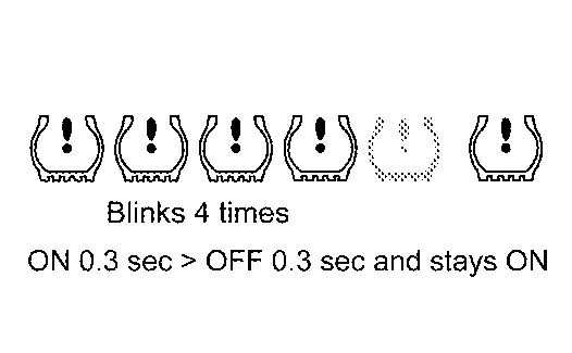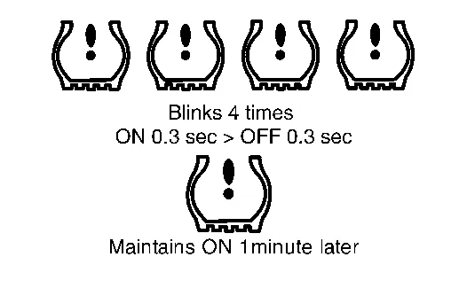 The low tire pressure warning lamp repeats blinking for 4 times. 1 minute later, low tire pressure warning lamp turns ON. |