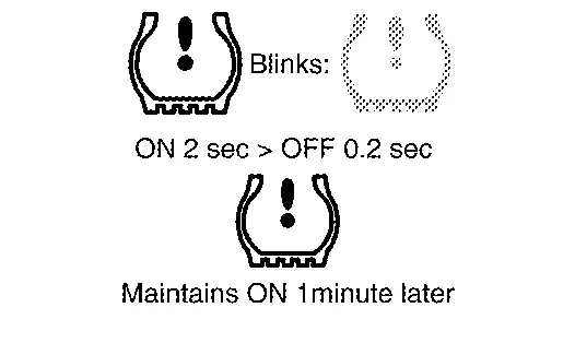 The low tire pressure warning lamp repeats blinking ON for 2 seconds and OFF for 0.2 seconds. 1 minute later, low tire pressure warning lamp turns ON. |