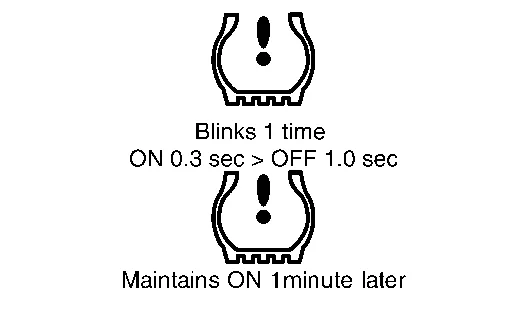 The low tire pressure warning lamp blinks once. 1 minute later, low tire pressure warning lamp turns ON. |