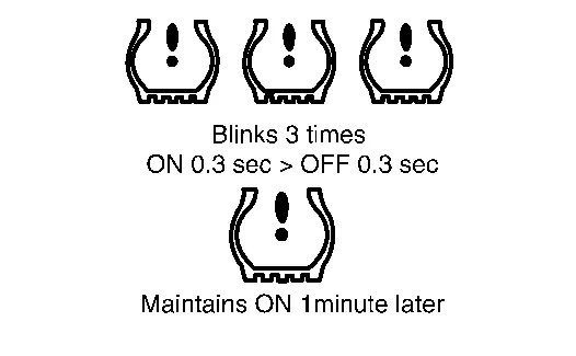 The low tire pressure warning lamp repeats blinking for 3 times. 1 minute later, low tire pressure warning lamp turns ON. |