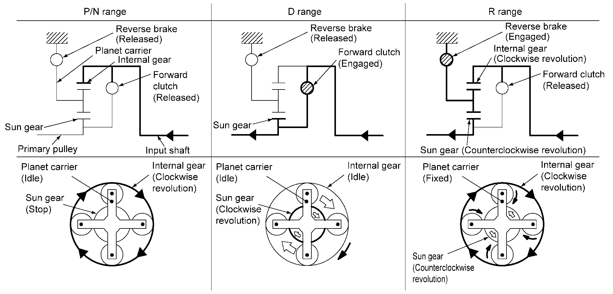 | Selector lever position | Parking mechanism | Forward clutch | Reverse brake | Primary pulley | Secondary pulley | Chain belt | Final drive |