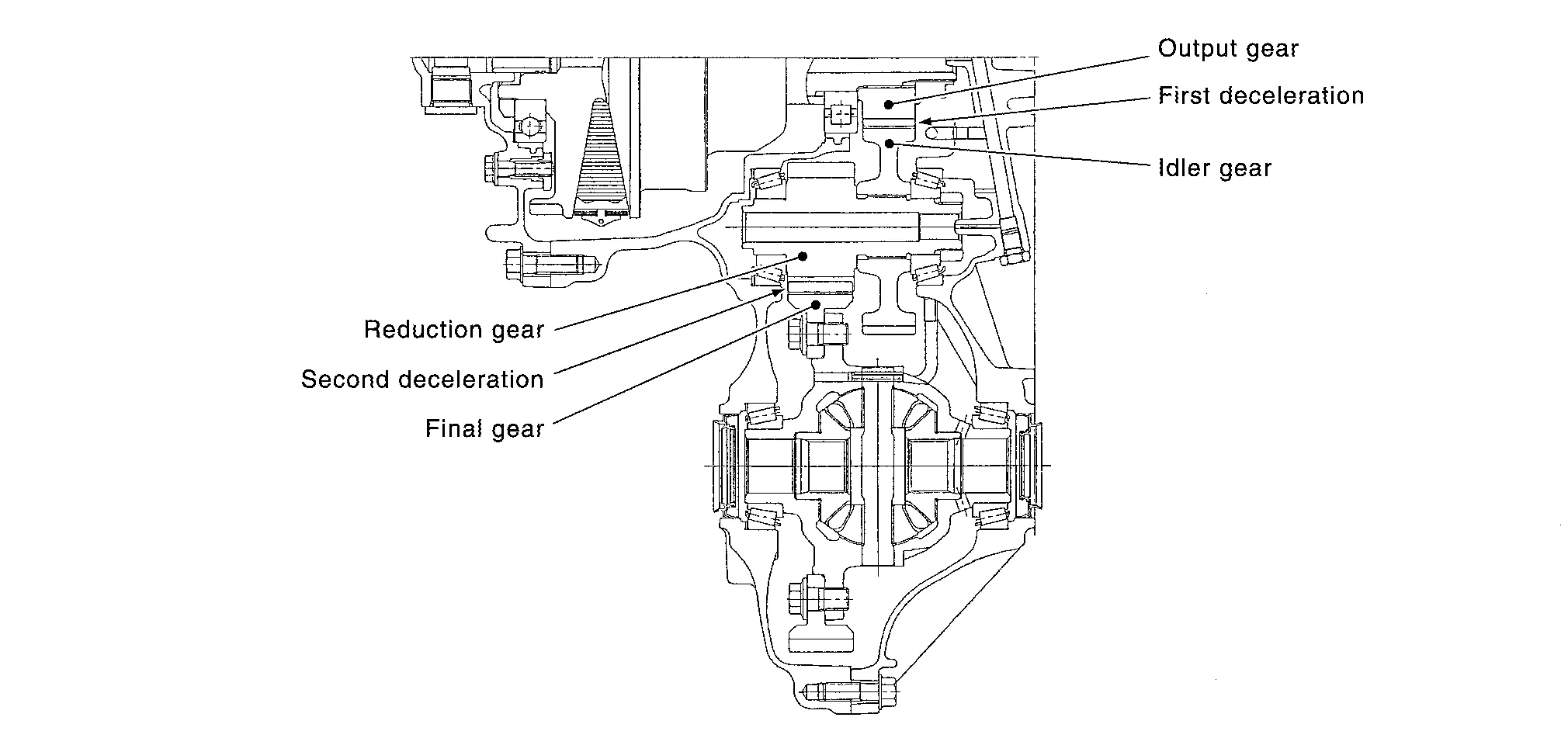 The deceleration gears are composed of 2 stages: primary deceleration (output gear, idler gear pair) and secondary deceleration (reduction gear, final gear pair). All of these gears are helical gears.