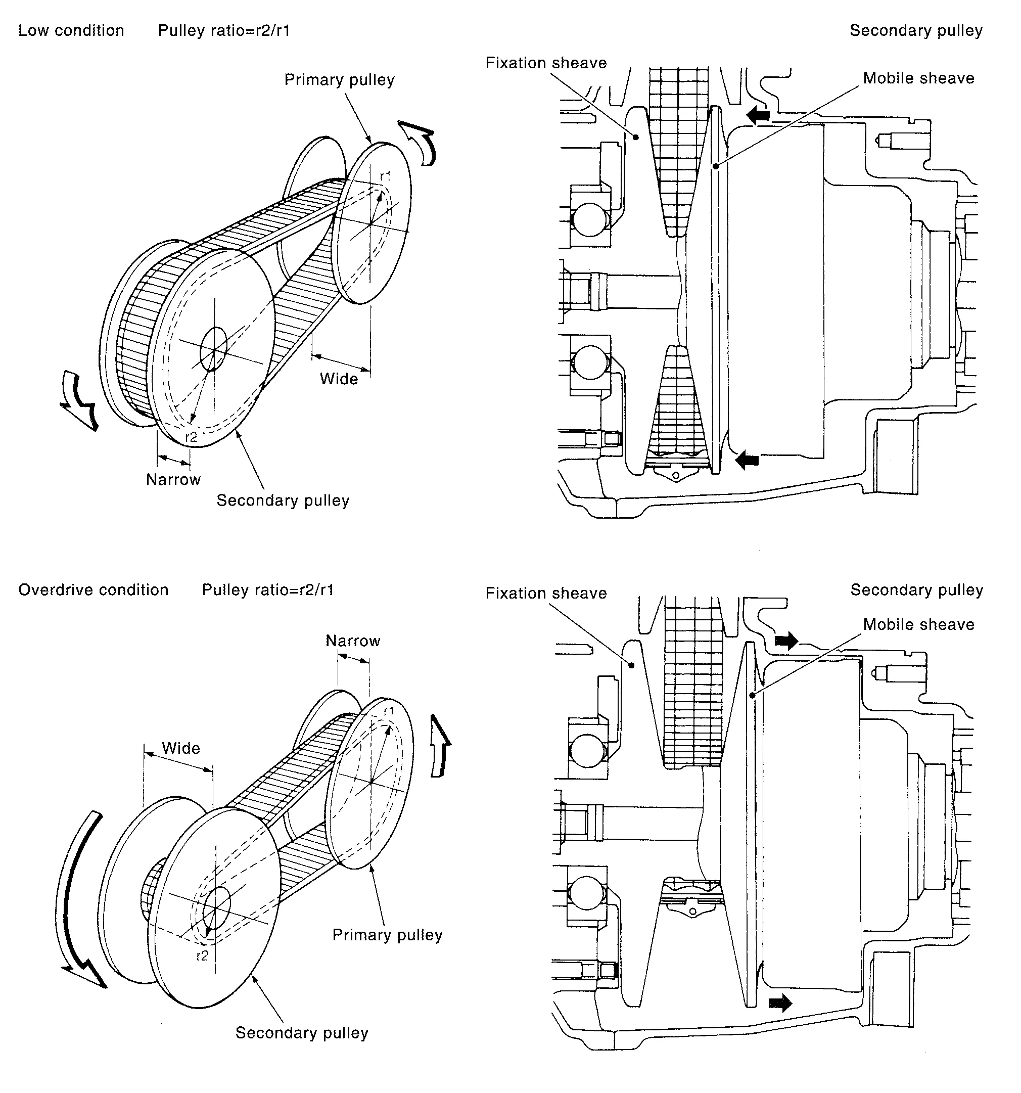 The movable sheave slides on the shaft to change the groove width of the pulley. Input signals of engine load (accelerator pedal opening), primary pulley speed and secondary pulley speed change the operation pressures of the primary pulley and the secondary pulley, and controls the pulley groove width.