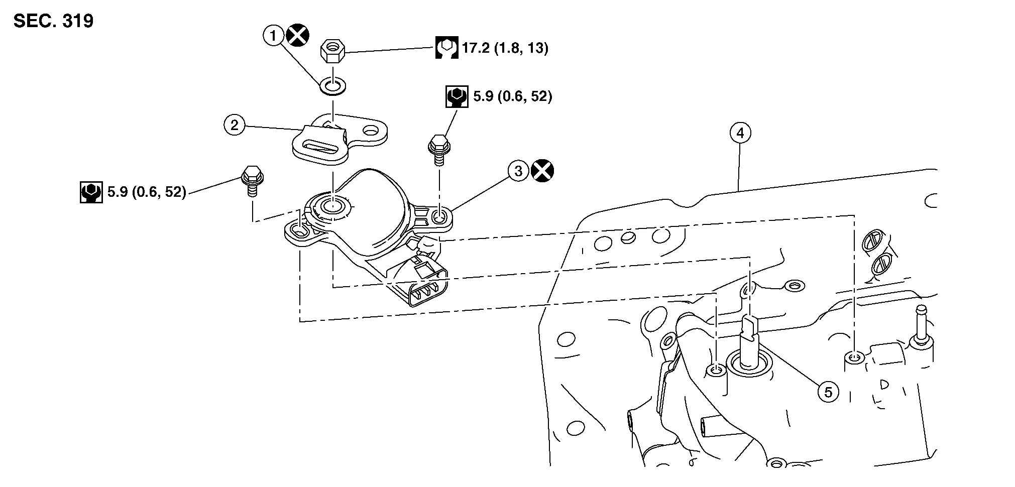 | 1. | Lock washer | 2. | Manual lever | 3. | Transmission range switch |