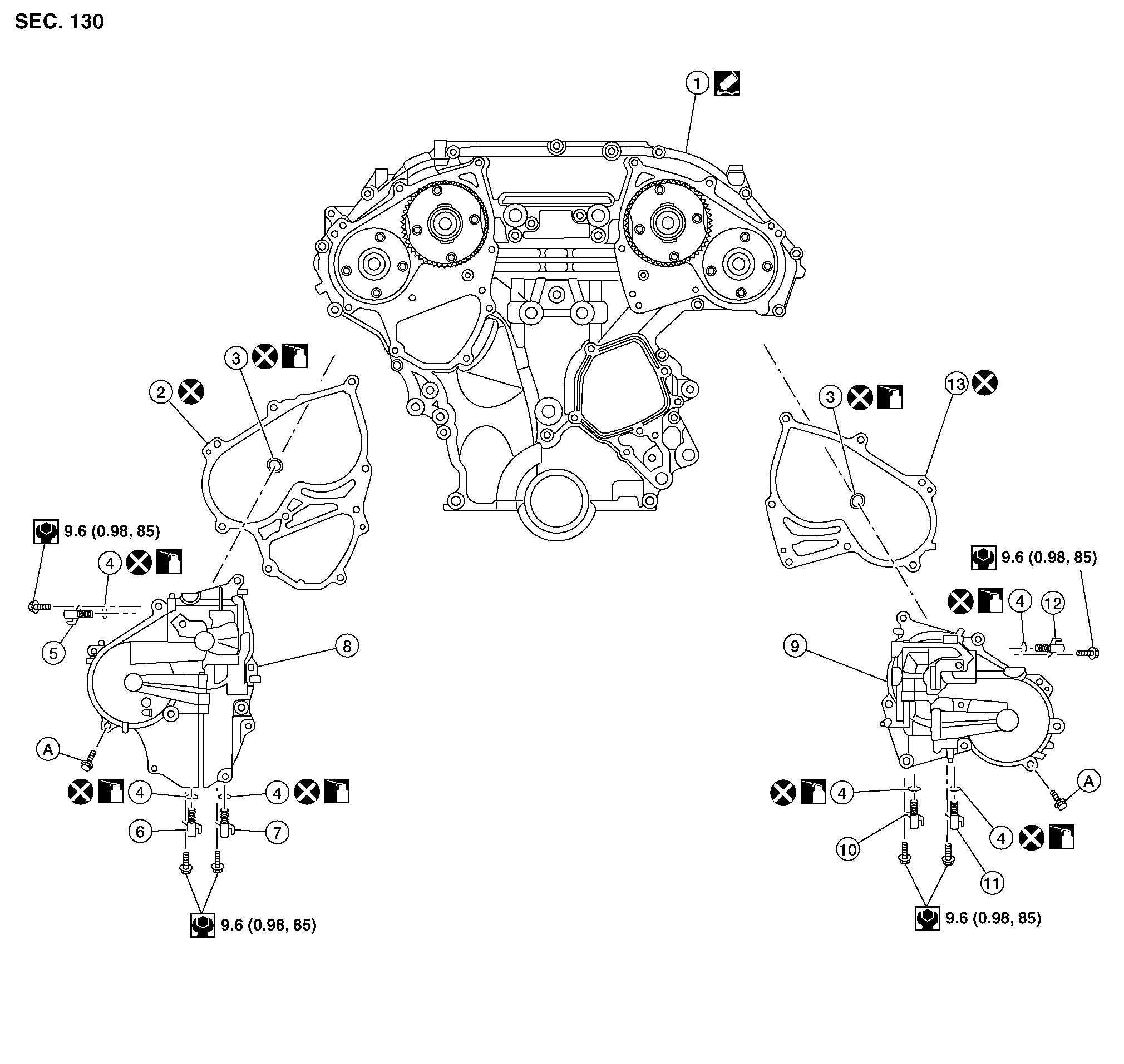| 13. | Valve timing control cover gasket (bank 2) | A. | Refer to Removal and Installation (bank 1) or Removal and Installation (bank 2). |