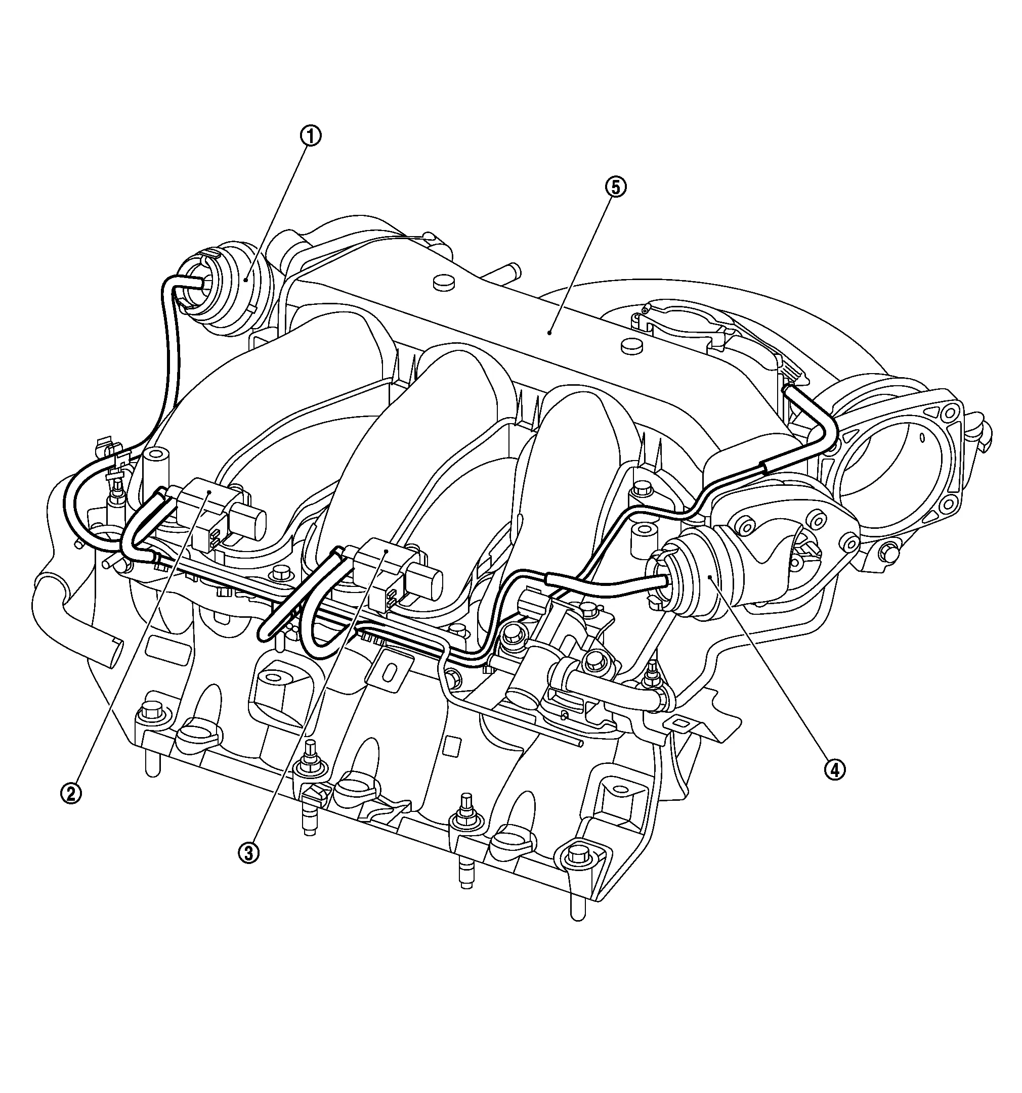 In the medium speed range, the ECM sends the ON signal to the VIAS control solenoid valve. This signal introduces the intake manifold vacuum into the power valve actuator and therefore closes the power valve. Under this condition, the pressure waves of the exhaust stroke do not disturb the pressure waves of the intake stroke of each opposite bank. Therefore, charging efficiency is increased together with the effect of the long intake passage.