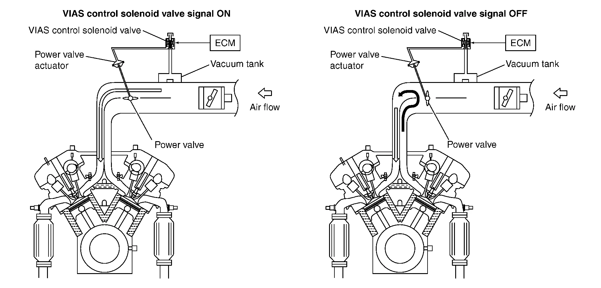 However, in the high speed range, the ECM sends the OFF signal to the VIAS control solenoid valve and the power valve is opened. Under this condition, the pressure waves of intake stroke are resonant with those of each opposite bank exhaust stroke. Therefore, charging efficiency is also increased.