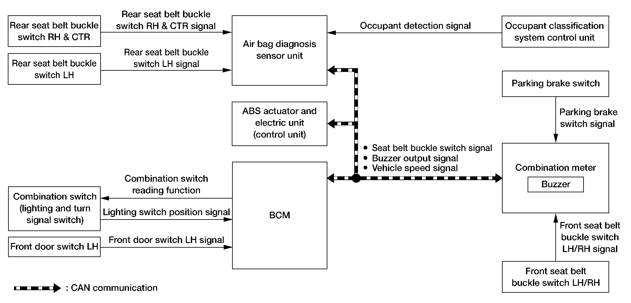 Air bag diagnosis sensor unit receives signals from the rear seat belt buckle switches, then transmits the signal to the combination meter via CAN communication.