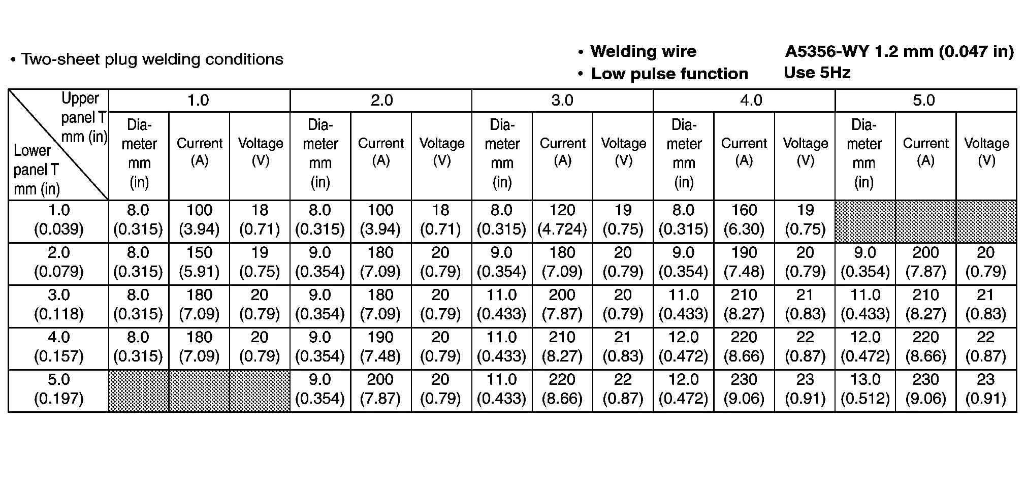 Consider the total thickness of two upper panels as the upper panel thickness. Using this thickness, apply the two-sheet plug welding conditions to set plug hole diameter, current, and voltage.