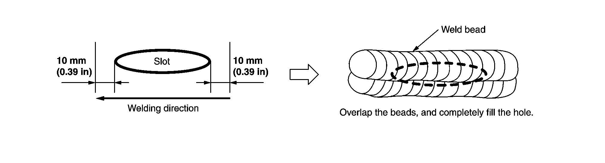 Welding range is from 10 mm (0.39 in) before the slot to 10 mm (0.39 in) after the slot.